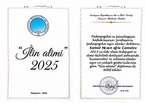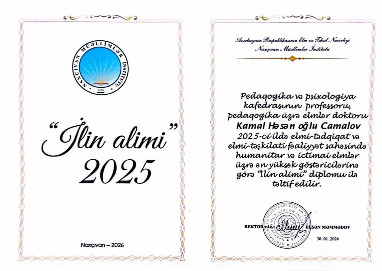 PEDAQOGİKA ELMLƏRİ DOKTORU, NAXÇIVAN MÜƏLLİMLƏR İNSTİTUTUNUN PROFESSORU, AZƏRBAYCAN RESPUBLİKASININ ƏMƏKDAR MÜƏLLİMİ KAMAL CAMALOV “İLİN ALİMİ” DİPLOMU İLƏ TƏLTİF EDİLMİŞDİR.